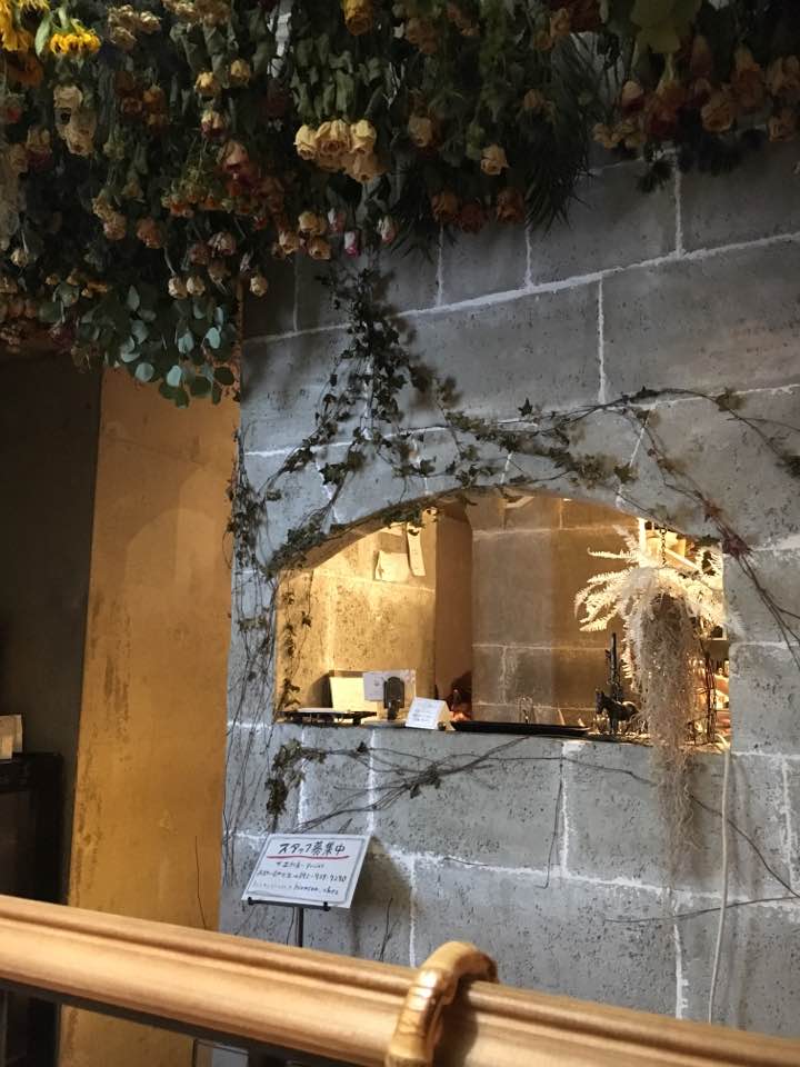 天井はいっぱいのドライフラワーつりさげてあり、